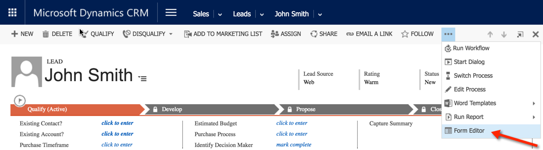 - On the lead detail screen, click the "..." button and then Form Editor.