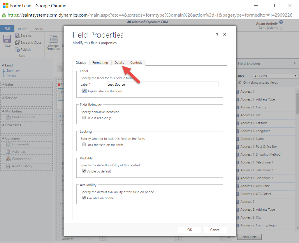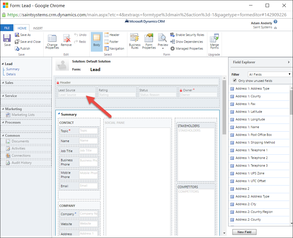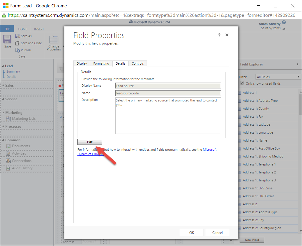 - In the Form Editor, locate the Picklist/OptionSet field you would like to map and double-click on it to open the Field Properties dialog. In our example, we double-click on Lead Source.