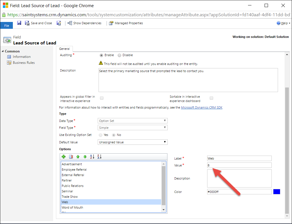 For the purpose of this article, we are going to walk through mapping the Lead Source field from the lead entity in Dynamics. The process is the same regardless of the Picklist/OptionSet field you wish to map.