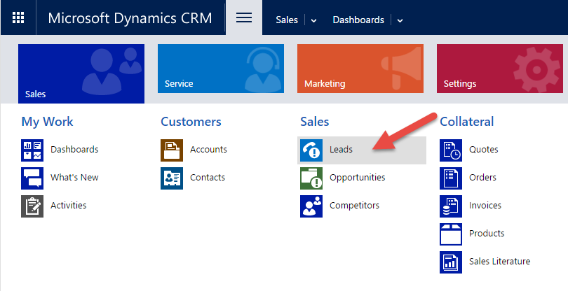 - Once logged-in, navigate to the entity (lead/contact) that contains the lookup field you would like to map. For example Sales > Leads.