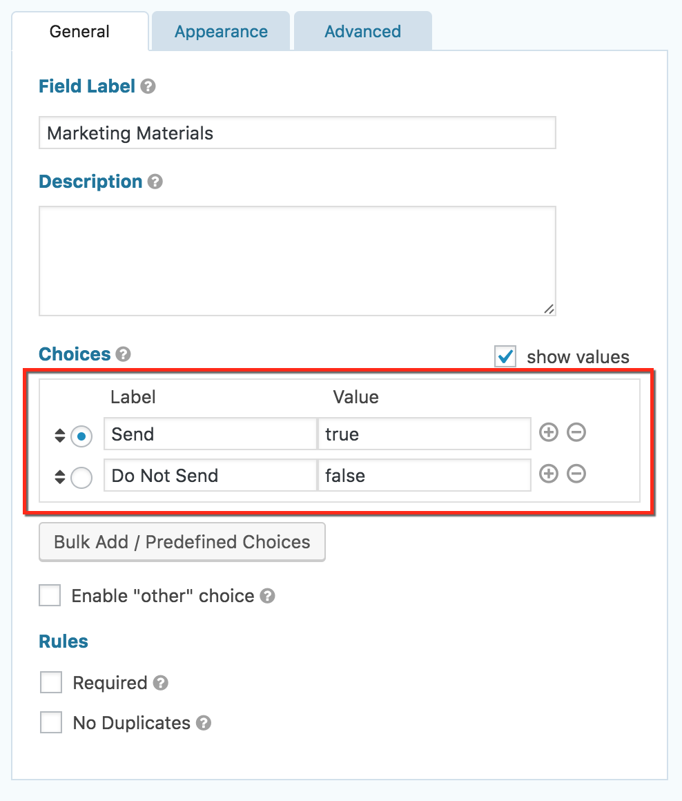 If you would like the user to be able to select the value for your Picklist/OptionSet field, the steps are very similar to above. The difference is that instead of only selecting the value of one option from a Picklist/OptionSet field in Dynamics, you'll need to make a note of each text label and numeric value and replicate those in your form's dropdown or checkbox field.